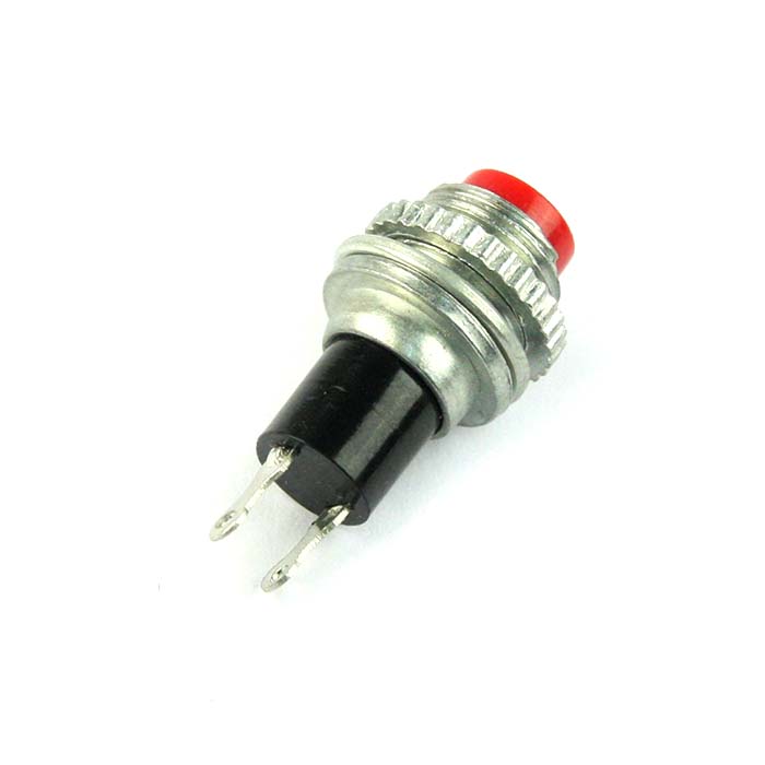 This is the basic SPST normally-open panel-mount momentary button. These buttons are rated up to 0.5A@125VAC. Overall length (including leads) is 27.5mm and has small solder lugs for connection. Mounting hole diameter is 10mm