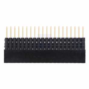 This extra-tall stackable 40-pin female header features two rows of 20 pins spaced with a 0.1″ (2.54 mm) pitch. It includes three 0.1″-thick spacers for additional clearance, and the extended pins allow multiple units to be stacked together. The 2×20 size is notably used on the Raspberry Pi...
